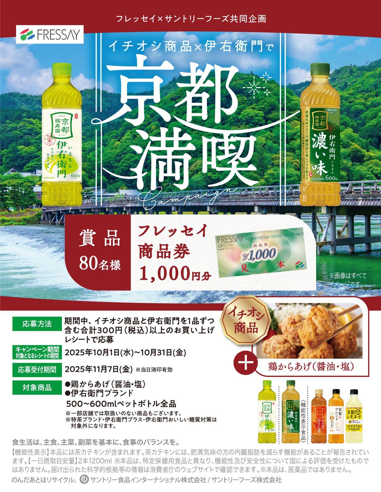 「フレッセイ×サントリーフーズ共同企画 イチオシ商品×伊右衛門で京都満喫キャンペーン」係