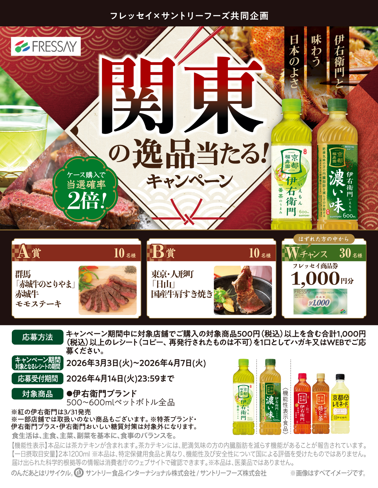 「フレッセイ×サントリーフーズ共同企画 伊右衛門 関東の逸品当たる!キャンペーン」係