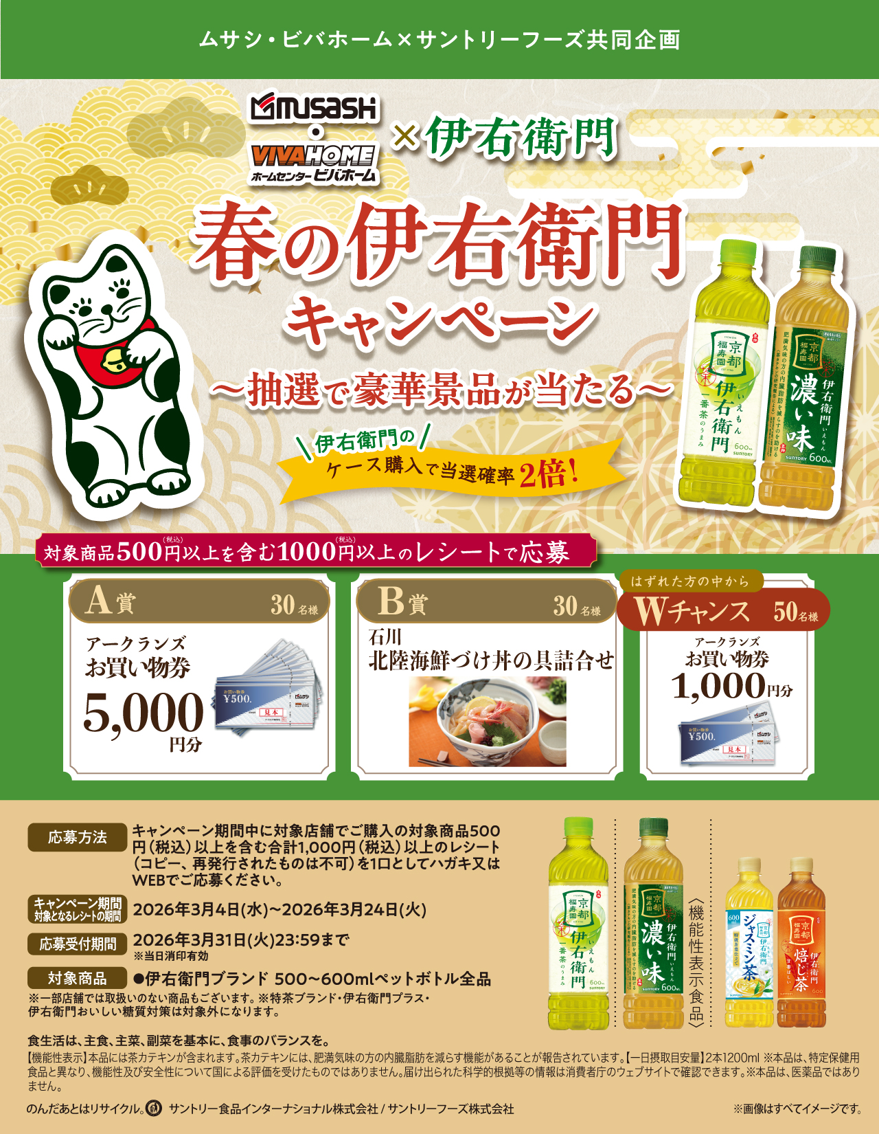 「ムサシ・ビバホーム×サントリーフーズ共同企画 春の伊右衛門キャンペーン」係
