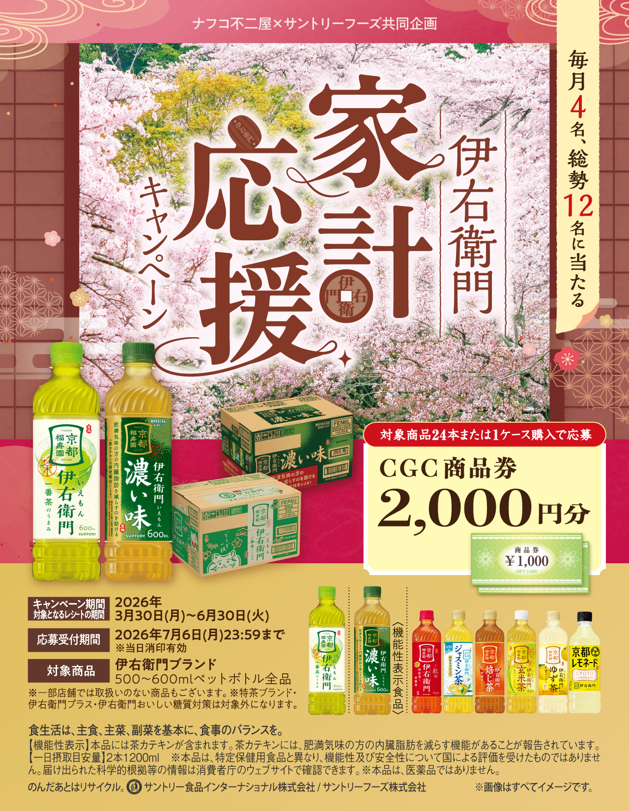 「ナフコ不二屋×サントリーフーズ共同企画 伊右衛門 家計応援キャンペーン」係