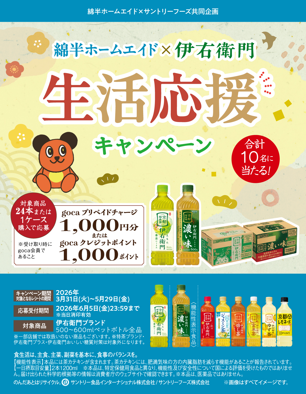 「綿半ホームエイド×サントリーフーズ共同企画 伊右衛門 生活応援キャンペーン」係